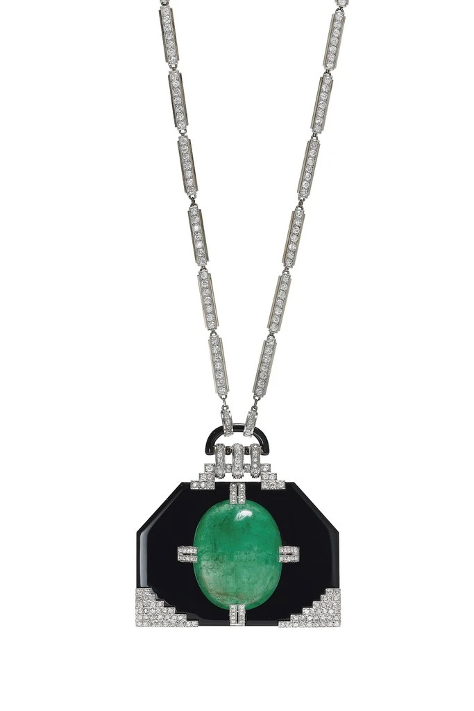2017佳士得《超越界限:歐洲前衛大師鉅作珍藏》,Georges Fouquet六角形黑瑪瑙片狀吊墜鑲蛋面祖母綠,1925年製,最後成交價為CHF492,500(逾新台幣1千5百萬元)。