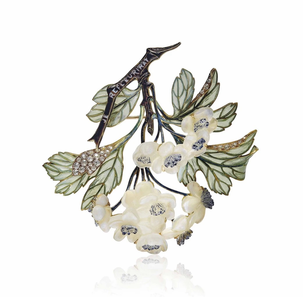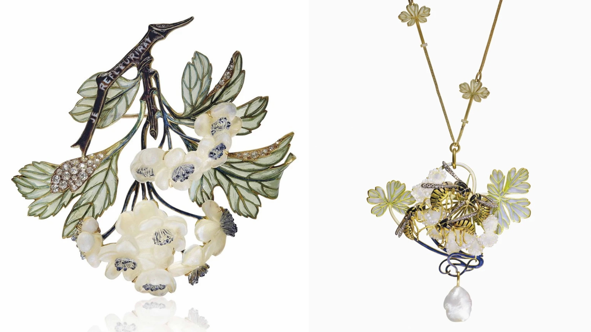 (左)2017佳士得《超越界限:歐洲前衛大師鉅作珍藏》拍品,René Lalique新藝術風格琺瑯、鑽石與巴洛克珍珠吊墜項鍊,1899-1901年製作,運用黑色琺瑯塗繪黃蜂身體。(右)同場拍賣拍品Lot 23,René Lalique所製之山楂樹胸針,空窗琺瑯,1899年,上有鐫刻je refleuriray字樣。