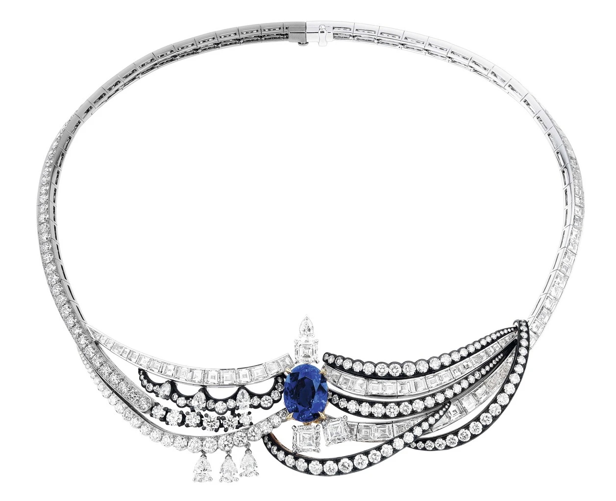 Dior à Versailles Chambre Du Roi藍寶石鑽石項鍊,白金、玫瑰金、黃K金底座與黑化表層銀質處理,鑲鑽415顆(45.92克拉),主石為11.54克拉橢圓形車工斯里蘭卡藍寶石,NT74,000,000。