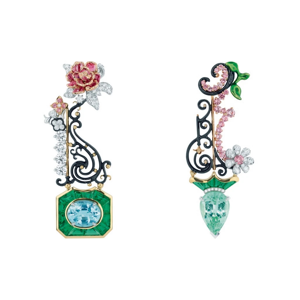 Versailles, côté Jardins高級珠寶系列,為Dior高級珠寶凡爾賽宮第二章節。(左)Hameau de la Reine鑽石戒指,運用黑色彩漆擬仿庭園花窗的意象。黃K金、白K金、粉紅色K金、鑽石、沙弗萊石、翠榴石、藍寶石、紫色剛玉、粉紅剛玉、粉紅鑽、帕拉依巴碧璽等,NT27,000,000。(右)為不對稱設計耳環,以花園之花窗為靈感。