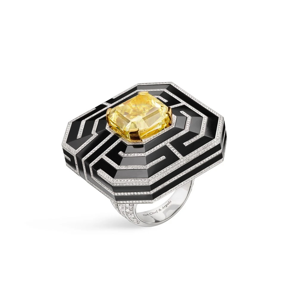 梵克雅寶2017 Le Secret高級珠寶系列Labyrinthe戒指,白K金、黃K金鑲主石13.01克拉枕形濃彩黃鑽,並以縞瑪瑙與鑽石裝飾成迷宮,價格店洽。