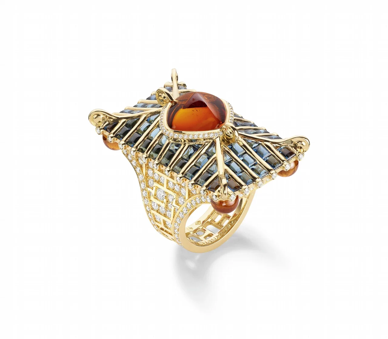 Chaumet在2018年推出由16只獨一無二款式戒指組成的Trésors d' Ailleurs,靈感源於中世紀猶太人婚戒,在設計上融入中國、日本、法國等多文化的建築造型。〈Madame Butterfly〉戒指從日本建築取材,sugar—loaf切割石榴石與屋頂相契合,主石可往上拉抬,下藏有祕密小格。