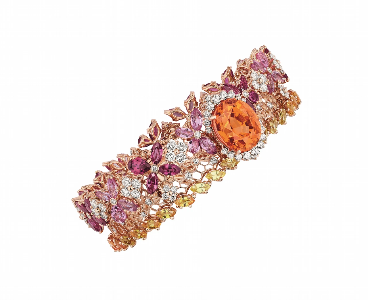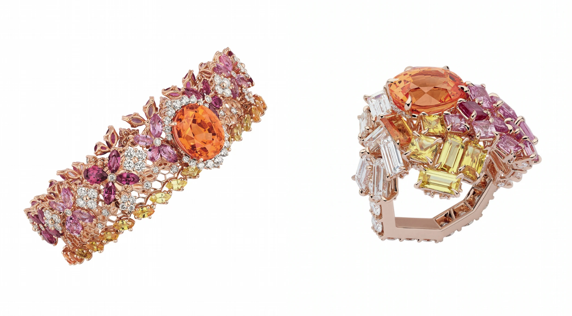 錳鋁榴石是Dior首位珠寶創意總監Victoire de Castellae最愛的彩寶之一,提及它芬達汽水般的色彩,給予人活潑溫暖的意象。(左)Dior Dior Dior Dentelle Popeline錳鋁榴石手鐲,玫瑰金鑲主石為13.29克拉橢圓形切割錳鋁榴石、橙黃藍寶石、紅寶石、鑽石等,NT12,500,000。(右)Gem Dior Orange Tangerine柑橘橙色石榴石戒指,NT9,400,000。