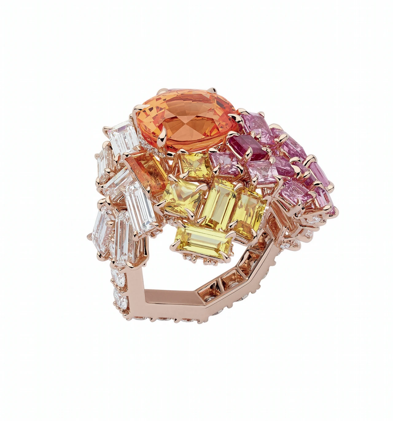 寶格麗色彩旅程第四章「羅馬晨曦」,BVLGARI Serpenti Braids of Aurora極光之辮頂級彩寶與鑽石戒指。玫瑰金鑲15.34克拉枕形切割錳鋁榴石、19顆buff-top弧圓形切割紅碧璽與紫水晶、密鑲鑽石。