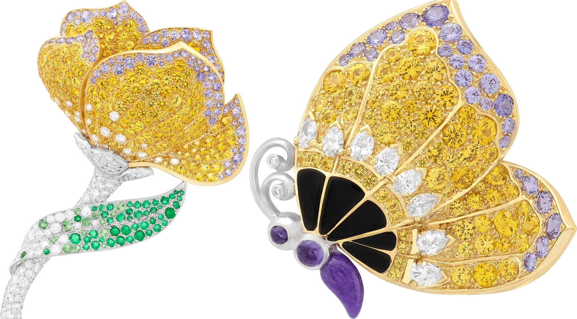 Van Cleef & Arpels Pétale de Papillon可轉換式胸針。花梗上方實是一隻蝴蝶棲停而成的花朵,可另拆做花朵或蝴蝶胸針佩戴。黃K金、白K金、鑽石、祖母綠、沙弗萊石、錳鋁榴石等,價格店洽。