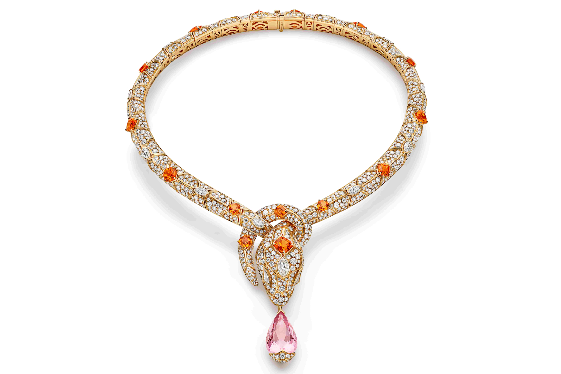 BVLGARI Serpenti Dawn’ s Daydream黎明美夢頂級彩寶與鑽石項鍊,黃K鑲鑲12.54克拉梨形切割摩根石、15顆切割錳鋁榴石、鑽石等。