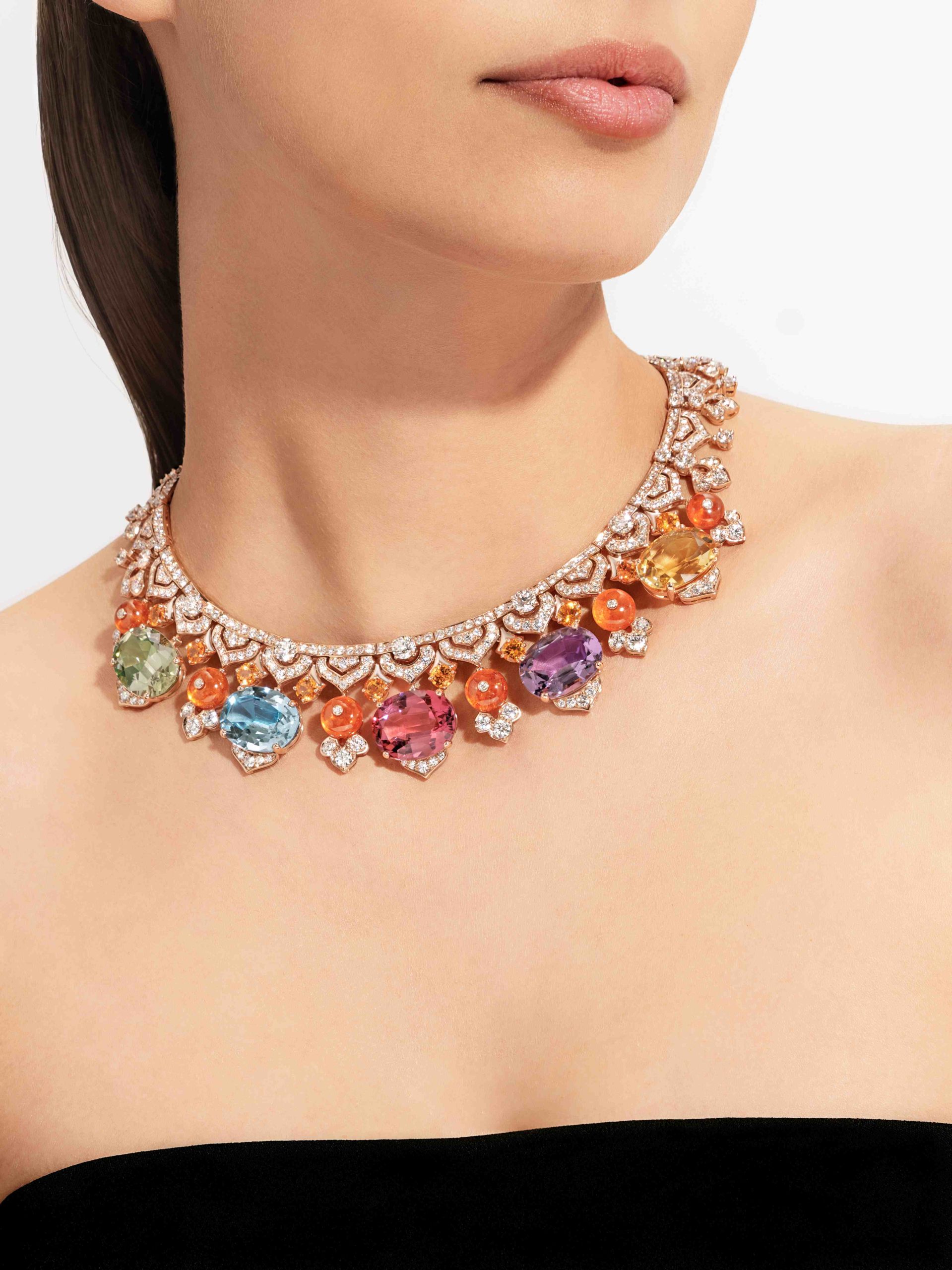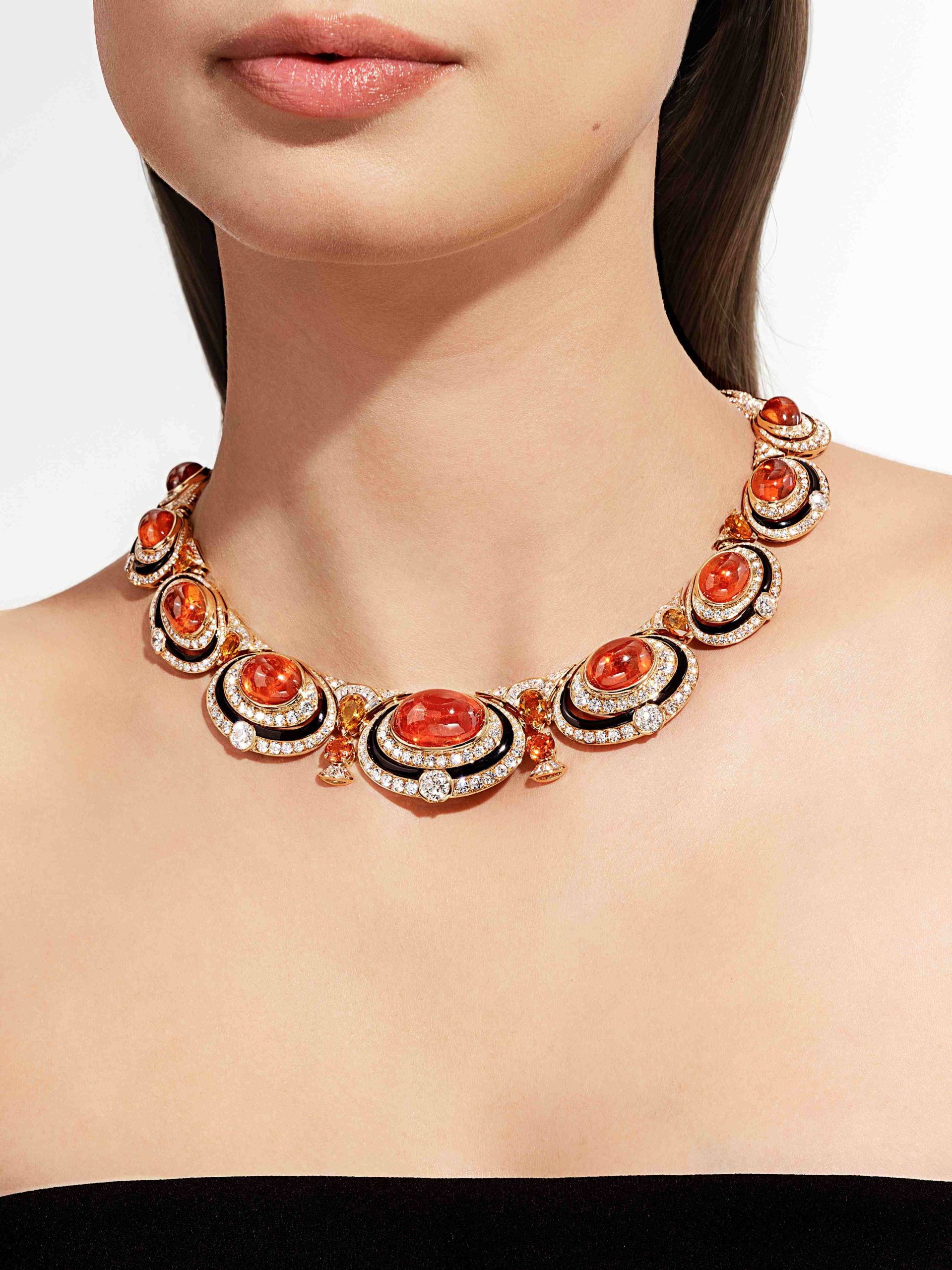 寶格麗色彩旅程第四章「羅馬晨曦」,Garnet Sunburst旭日石榴石頂級彩寶與鑽石項鍊。黃K金鑲縞瑪瑙、9顆蛋面切割錳鋁榴石(總重約120.70克拉)、3顆圓形切割錳鋁榴石、黃水晶、鑽石等。