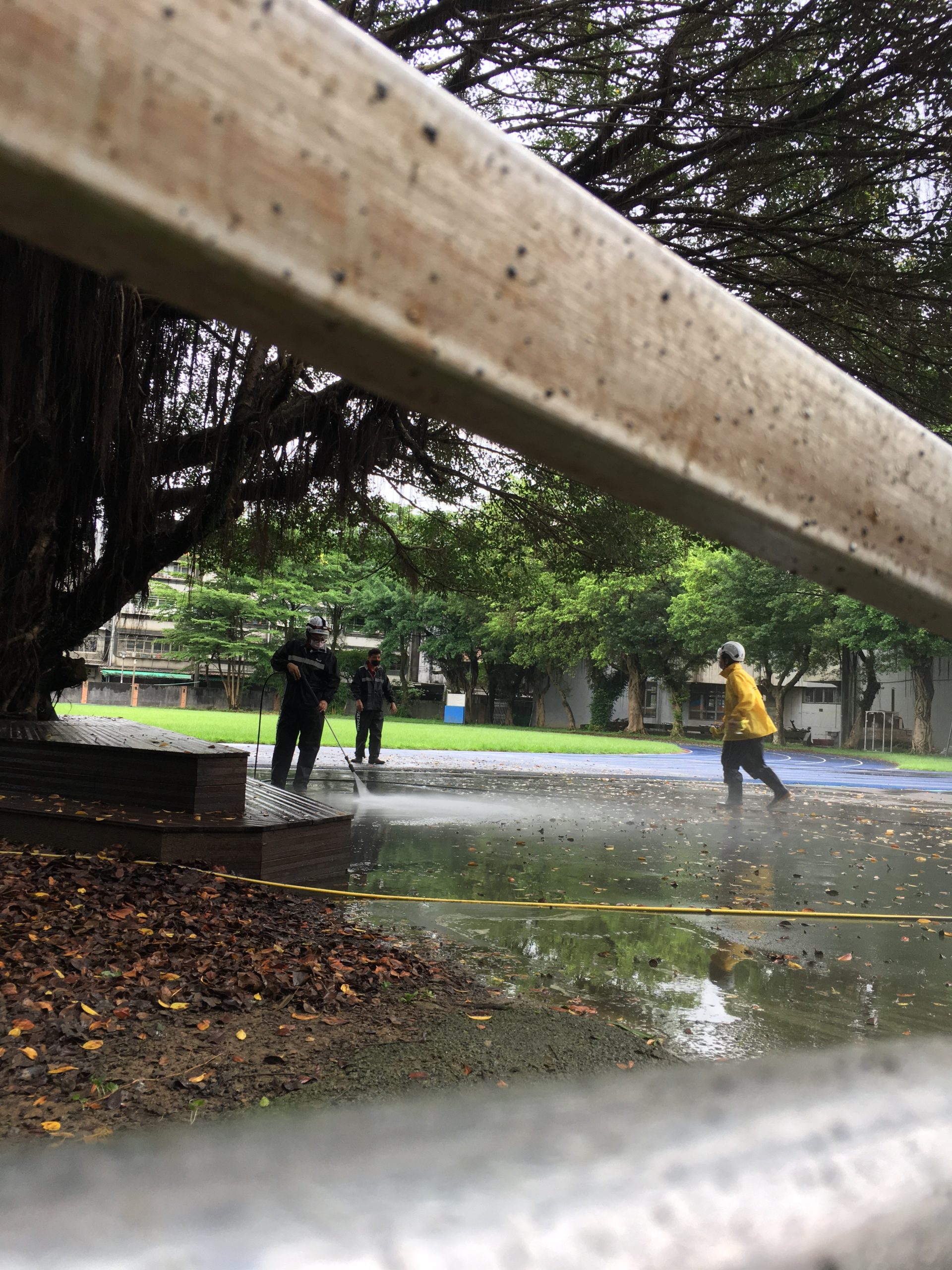 原鎖定藝文場館,是想著公共場所曝光度關注度較高,熟知「帶街友洗地」一事,在教師群組叮噹相傳,又基隆潮濕多天雨,學生戶外運動空間容易淤泥生苔,發生多起滑倒骨折事件,在多數場館和校方資金不到位的狀況下,該怎麼做?