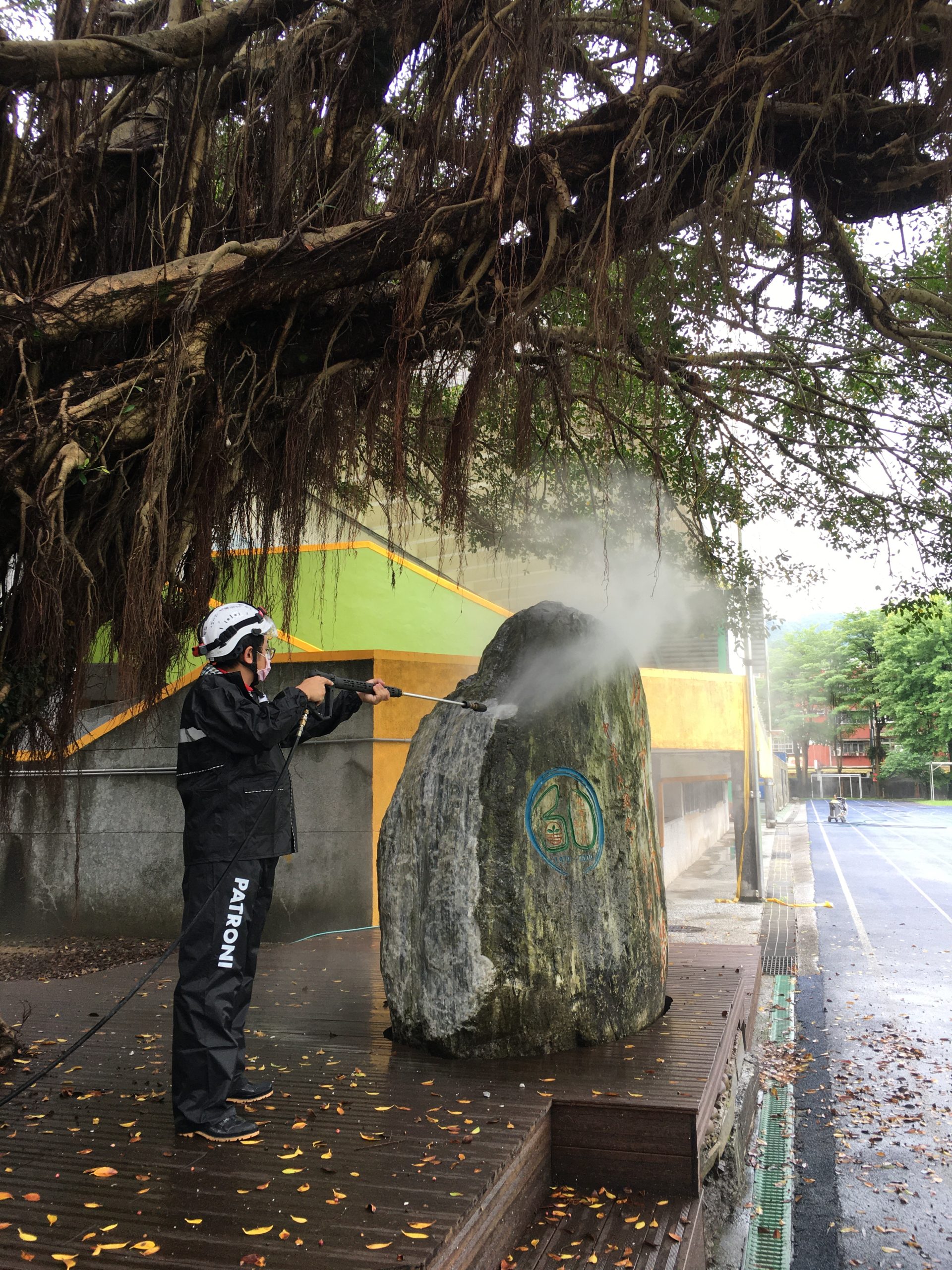 友洗社創陸續清洗紀州庵、剝皮寮、紅樓、艋舺教會、寶藏巖的廣場鋪面,後在朋友介紹請託下,收到基隆成功國中老師詢問,若一天工資6000元,能否到校清理戶外地坪?「6000當然不能去洗,北七(台)喔!」心裡想連工錢都不夠付,他依然「自帶辦法」帶隊執行完畢,成功國中成為團隊第一個清洗的校園。