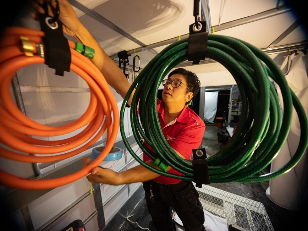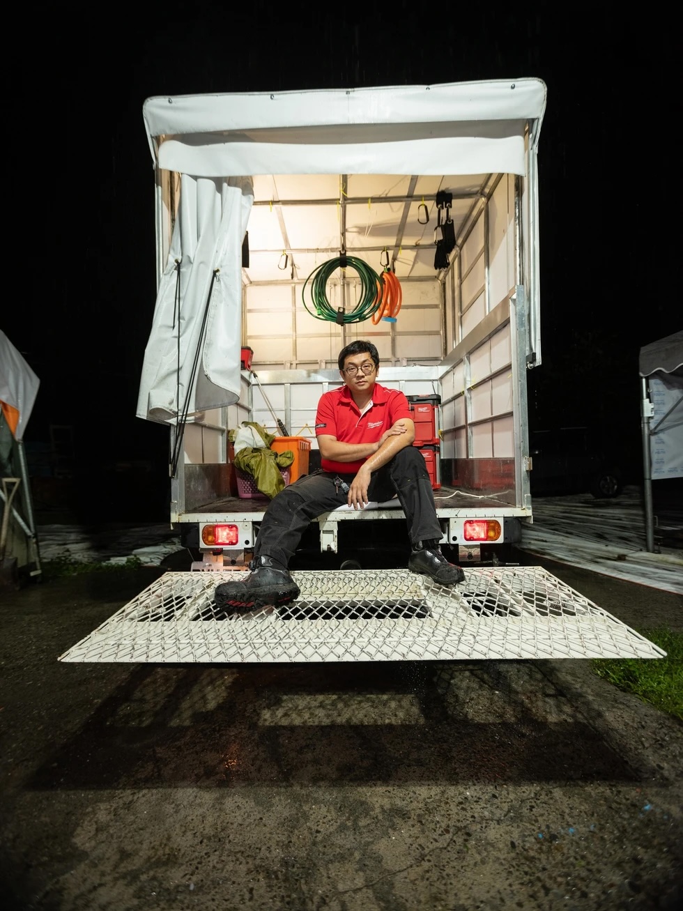 訪談日夜來大雨,工寮夥伴貼心拿出火爐備用,「我們沒有像立青那麽文明。」水電小哥說得有些害羞。環看鐵皮鋼架搭建的半開放工具間,小室裡琳瑯滿目器具傢伙各有主人,也互為各主人所用,羅列得極美,互以幾何線條相望。棚頂下齊整吊晾雨衣和毛巾,林立青依然保有監工習慣,帶人也是如此這般,從細節處教起:洗曬衣物、晾曬收納、收管線等等,曬過的毛巾在美沃奇紅箱裡排隊疊好,如此薄小的物件,都被照顧得妥妥貼貼。