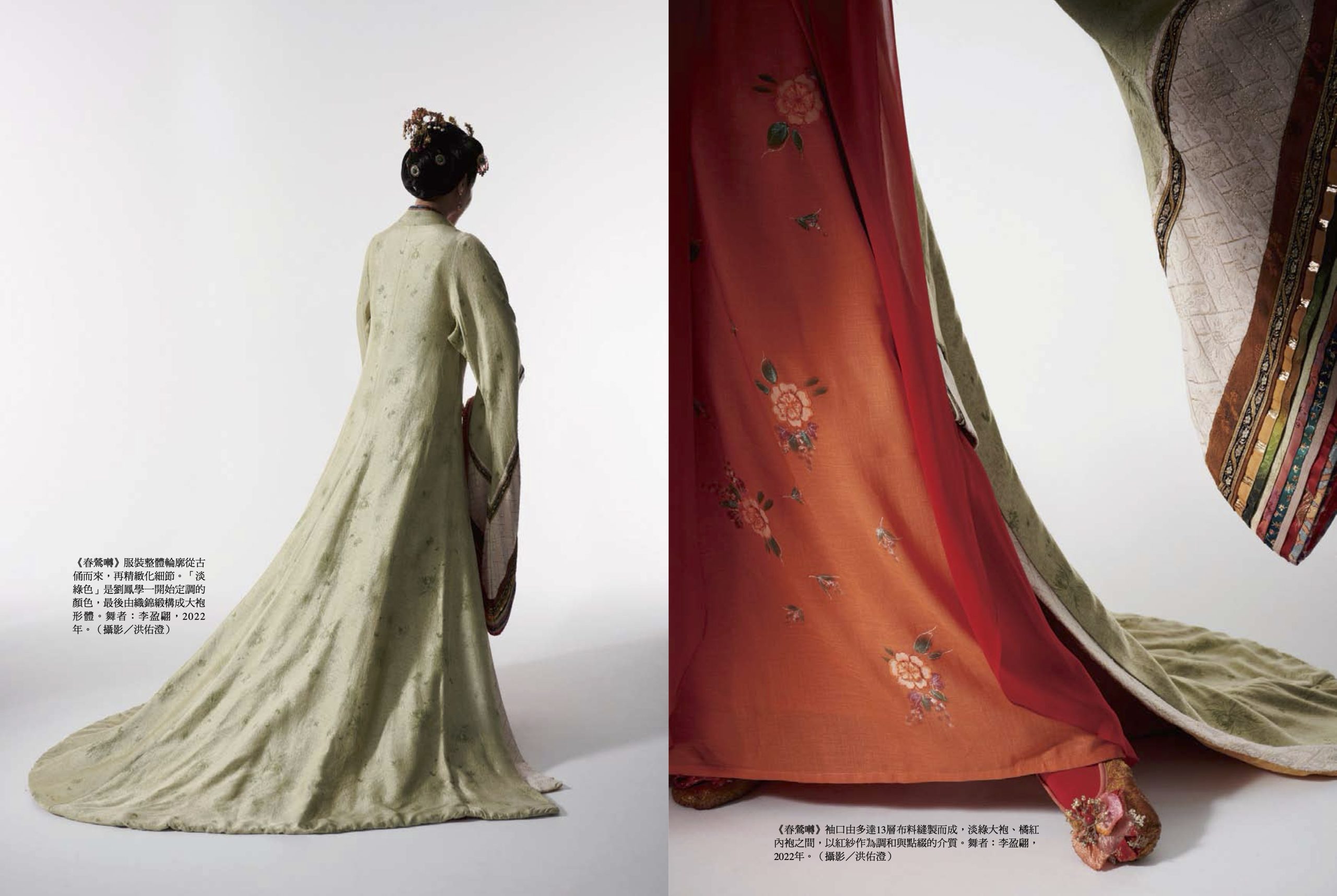 同首發訪談一般,編輯小組用重新梳理和記錄心態,邀請80後攝影師洪佑澄拍攝服 裝細部。唐樂舞服裝/頭飾設計向來都掛劉鳳學和翁孟晴兩個人的名字,絕妙在於織就唐朝宮廷服裝的富麗,皆出自臺灣歡鬧的市井──永樂市場布市。洪佑澄工業設計背景出身,在時尚、珠寶、人像拍攝都有涉獵,和翁孟晴在布堆裡「萬中選一」同樣是個細 節控,在業界以自製道具著稱,找上他,心想他的觀景窗定會與唐樂舞有一番跨越世代 的對話──果真,大白幕無 所遁形的光影下,在場者(以及正在翻讀此書的你)細賞如 何在極為闕如的參考資料下,憑藉古俑、畫像、詩詞,織造精緻化一件能跳舞、又能呈 現唐朝美學的服裝。